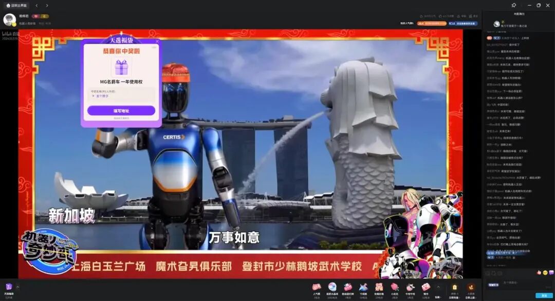 2月8日晚8点,智元机器人举办“机器人奇妙夜”直播活动,在B站、视频号等多平台同步进行。仅B站“稚晖君”直播间就吸引30.5万人气,获4.2万点赞。当晚最大奖品为名爵MG4汽车一年使用权,通过B站官方工具随机抽取,参与者需关注账号并发送指定弹幕。最终中奖者为公司内部员工。