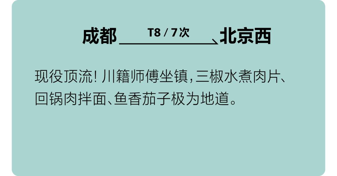 资深铁路博主@藻虾 AmanoShrimp 因大学时自热火锅导致肠胃不适,便执着于现炒餐车。他的“火车美食地图”里藏着诸多惊喜:T8次(成都—北京西)的水煮肉片弥补了他在成都的遗憾,厨师还会主动询问口味;Z6次(南宁—北京西)的芋头扣肉,荔浦芋头绵密,扣肉香润不腻。他发现铁路菜的常青树如回锅肉、麻婆豆腐,皆因食材耐存、烹饪易标准化、味道下饭。不同铁路局的菜品还带着在地特色,呼和浩特局的回锅肉放干辣椒,成都局的则加甜面酱,酱香回甜。日本留学时他发现当地餐车多已消失,中国的移动烟火气吸引着外国铁路爱好者。对他而言,餐车的镬气与热菜是旅途的扎实锚点。