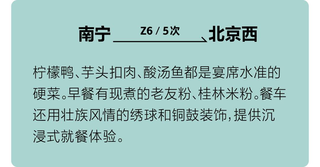 高铁餐车多售卖座位、提供冷链盒饭,与现炒无缘。真正的“移动酒楼”只存在于能明火颠勺的绿皮车中,通常在跨铁路局车次的硬座与硬卧连接车厢处。不久前,Z100/99次(上海—广州)因更换车型,其现炒餐车将消失,引得众人送别。这趟车曾因直通香港的背景,餐饮标准国际化,招牌红烧鲈鱼先煎后烧,广受南北旅客喜爱。