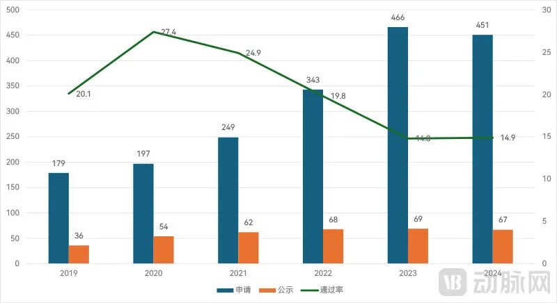 我国创新医疗器械技术含量正逐步提升:2019年起,三类创新器械申请进入审批程序的通过率逐年下降,2024年已降至不足15%,体现监管机构审核趋严。