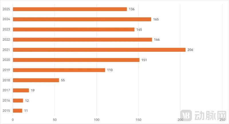 FDA官方数据显示,近年每年有100多款产品列入突破性医疗器械名单,2021财年(10月至次年9月)超200款创纪录,平均每年维持在150-170款区间。2025财年前三季度已有136款,全年数量预计仍在此范围。