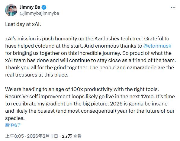吉米・巴在离职声明中称:“是时候重新调整我对全局的认知方向了。2026年将会很不一般,或许是关乎人类未来最忙碌也最具决定性的一年。”他同时感谢了马斯克,提到自己有幸在xAI创立初期参与联合创办,珍惜这段特别的共事经历,并承诺未来会以团队好友的身份和公司保持密切联系。