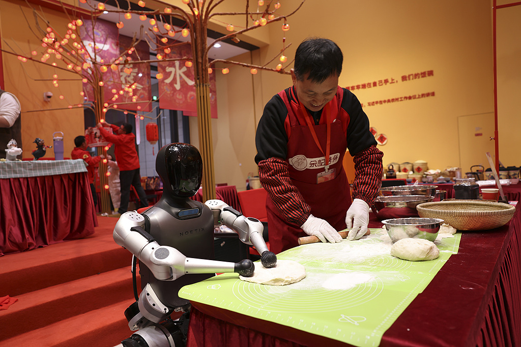 1月19日,北京中国非物质遗产馆,机器人帮衢江烤饼传承人揉面。