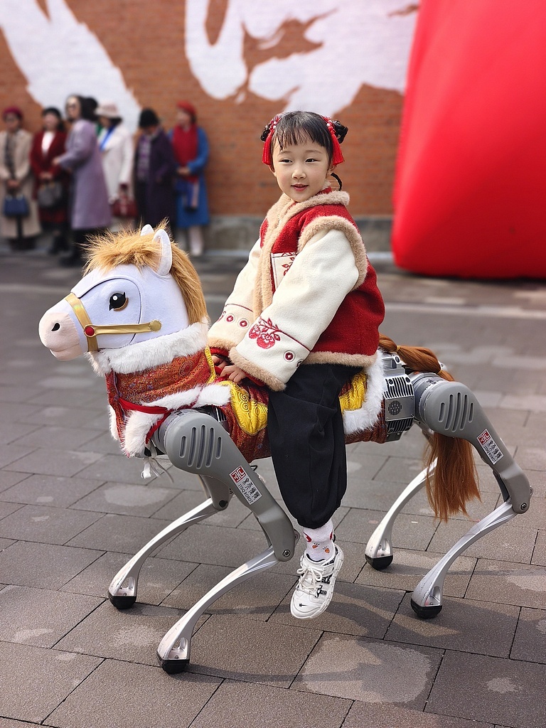汉口百年里份咸安坊的非遗大集上,49项武汉都市圈非遗项目汇聚。广场上,机器狗装扮的机器马被小女孩骑着,沿途喊“马踏鸿途”,吸引众多市民围观拍照。