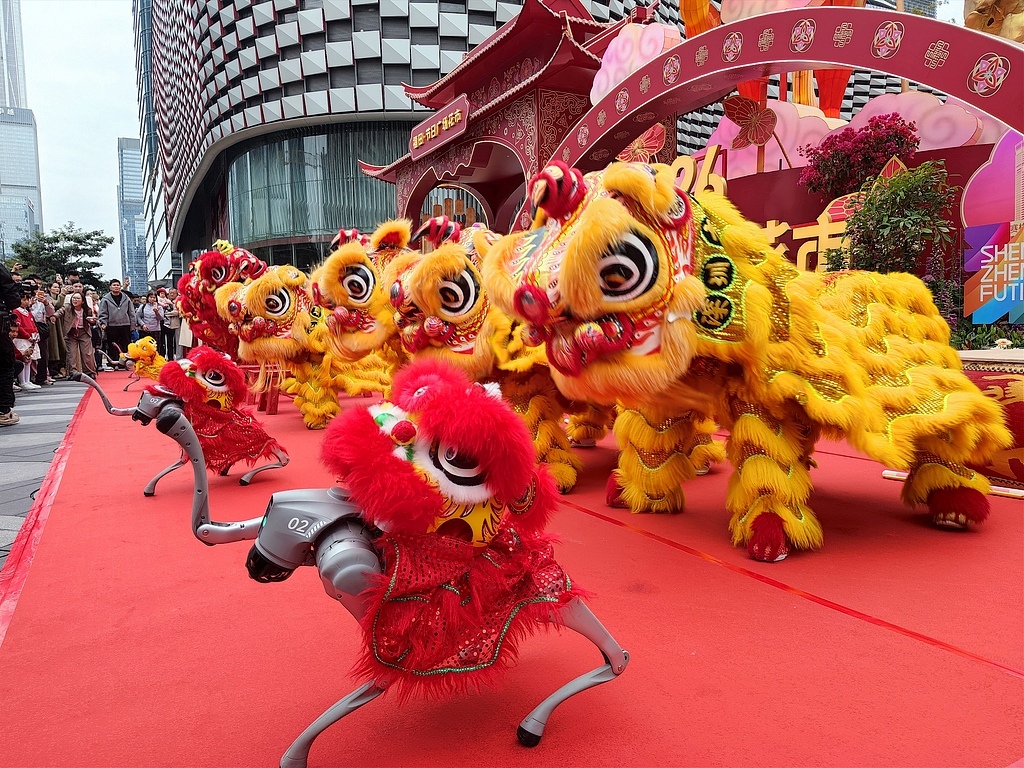 2月10日,深圳2026迎春花市福田节日广场花市开幕式现场,机器人与演员搭档跳《火力全开》,机器狗还和醒狮队同台表演。