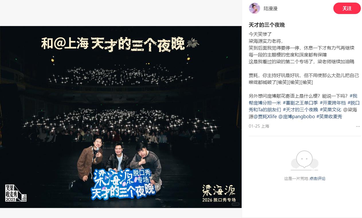 观众在小红书分享梁海源专场《天才的三个夜晚》的演出repo截图。