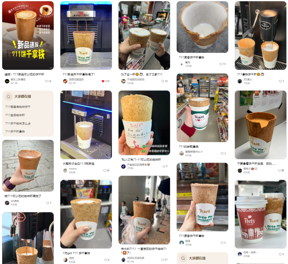 “麦香饼干杯”系列上市后,引发了大量网友讨论。在小红书搜索“711饼干杯咖啡”,能看到很多消费者晒出手持这款咖啡的照片。