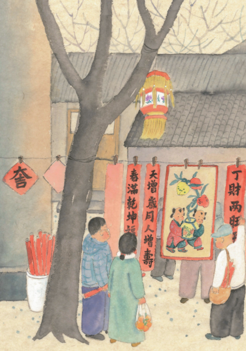 叶家煮锅往西的一条小胡同里也十分热闹,那里全是卖对联、灯笼的——两棵树之间拴根绳子,用夹子夹着红纸,展示着各式各样的字和画。胡同里住着一位管理公园的老绿化工,房子是单位租的。每年年底,植物进入休眠期,他便清闲下来,在出租房对面摆起小摊卖对联和年画。对联是他手写的,像是颜体风格,内容几乎都和“家”有关,比如“丁财两旺平安宅,富贵双全幸福家”“天增岁月人增寿,春满乾坤福满门”。他还会画年画,笔触质朴、色彩鲜艳,十分生动。