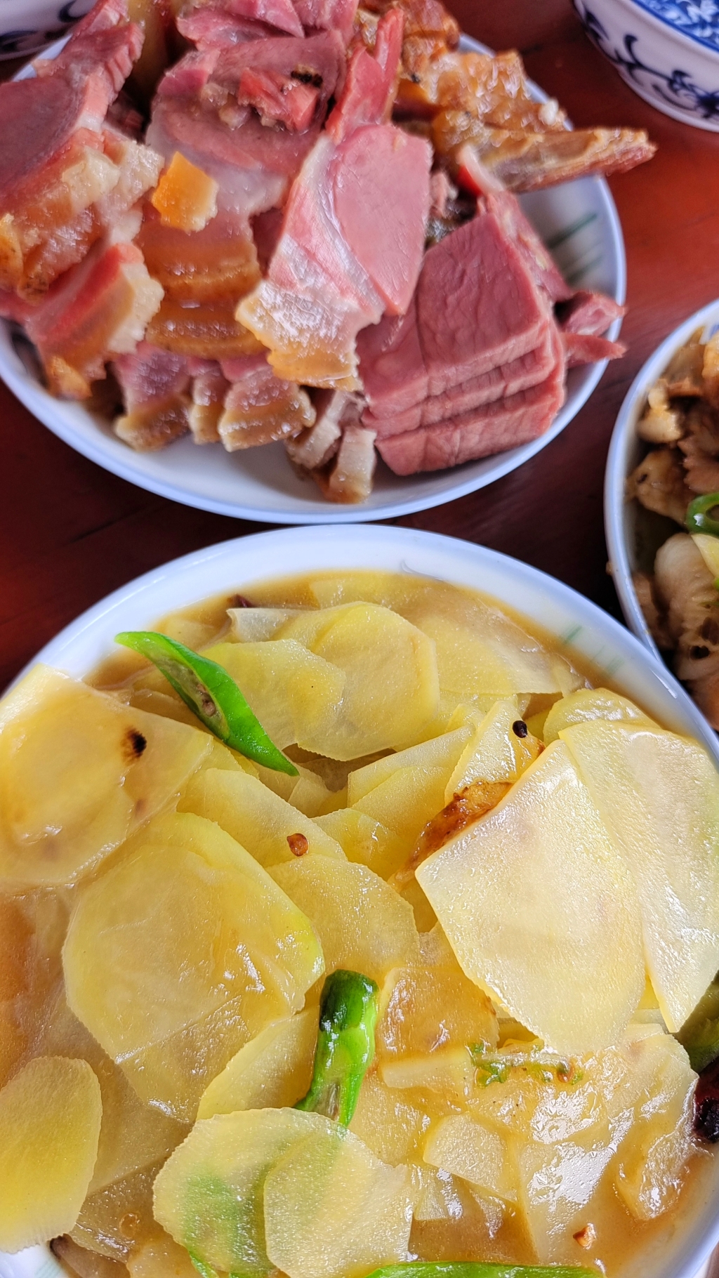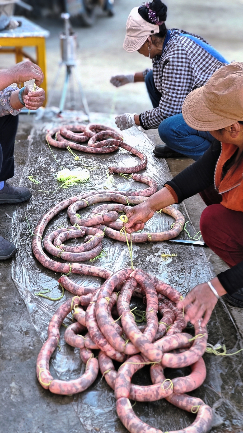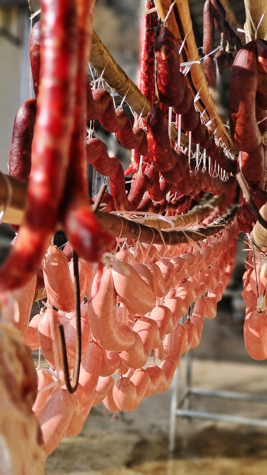 农户的小院中,柴火噼啪作响,大铁锅升腾着热气,刚宰杀的土猪肉香裹挟着炊烟,飘遍整个村落。瓷碗里的酸菜白肉堆得冒尖,血肠入口鲜香,脆爽的酸菜裹着猪油香,直沁心脾;炖得酥烂的五花肉,就着坛中腌菜,一口下肚暖意直达脚后跟。