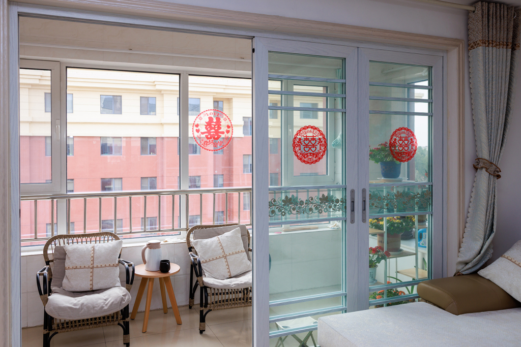 2026年2月15日,耿进旺家的阳台。其子耿庆鎏于2月14日在社区举办婚礼,家中贴有双喜字。
