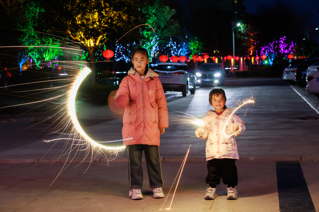 2026年2月15日,耿山口社区里,春节将至,孩子们迫不及待玩起仙女棒。