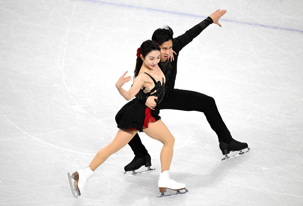 2月15日,隋文静/韩聪(右)在双人滑短节目比赛中。新华社记者 程敏 摄