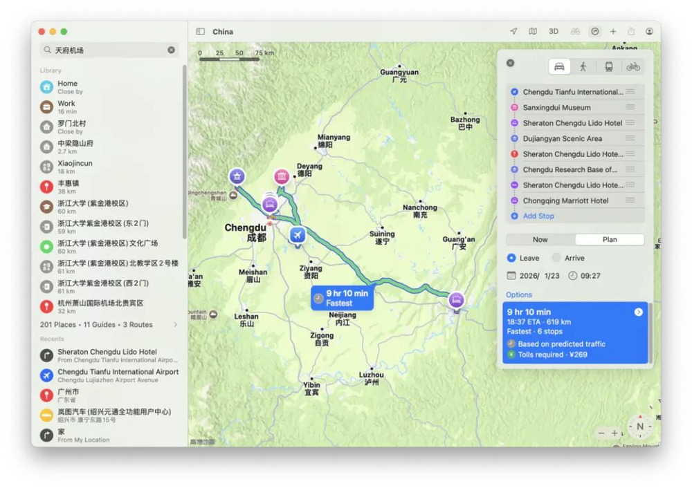 从1月10日11点航班落地,到12日19点抵达重庆万豪,这56小时可支配时间里,自驾比公共交通多了近6小时活动时间。更重要的是,公共交通还有隐形的“等候成本”:机场大巴、火车等都需要提前抵达,这部分时间地图软件不会计算。比如从天府机场到三星堆,公共交通比自驾多花近2小时——航班11点落地,取完行李11:27,最近的机场大巴是11:40和12:00,光第一段就多等13到33分钟;到春熙路后还要等30分钟才能转车去三星堆。