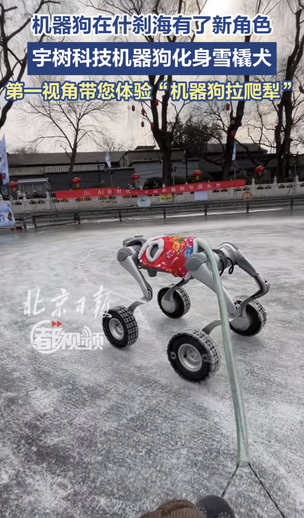北京什刹海冰场上,冬日热闹非凡。游客们坐着各式坐骑驰骋,最吸睛的是化身赛博“拉橇犬”的宇树Go2机器狗。它重15公斤,裹着红色大花袄,脚踏轮子,拉着坐小孩的爬犁在冰面灵活穿梭,引得路人纷纷拍照。