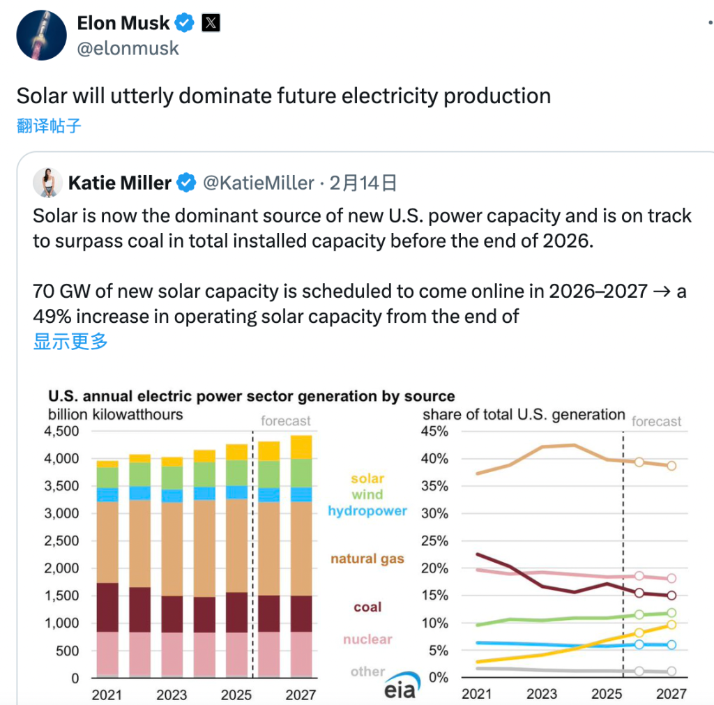 马斯克此番言论源于一篇分析文章,该文章指出光伏已成为美国新增电力装机的主要来源,预计2026年底前将超越煤炭装机容量。数据显示,2026-2027年美国将新增70GW光伏发电装机,较2025年底规模增长49%。