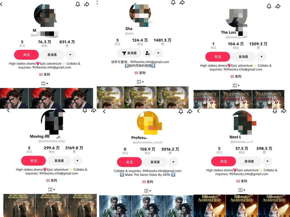 二是用户对内容的喜好明显,比如第四个账号粉丝比第五个账号多100多万,但点赞量相近,均为3000万量级,说明AI短剧互动性、关注度高,且在观众足够成熟时,不依赖账号粉丝量。这也从侧面反映出海外平台环境的包容性,让工作室能顺利打造矩阵账号。