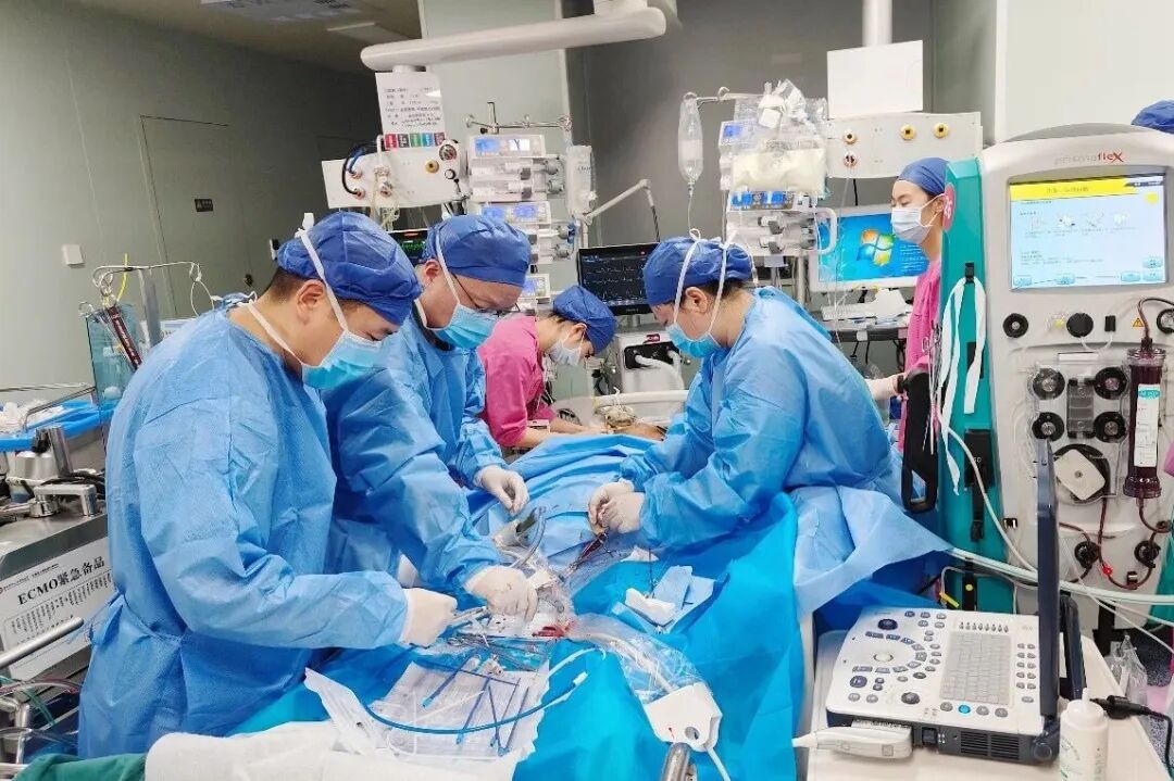 几天前,41岁的刘先生突发心脏骤停,情况危急。冠心病五病区副主任闫瑞、综合ICU岳胜副主任等专家立即展开心肺复苏。因病情极度危重,体外循环与体外生命支持科主任李建朝紧急实施ECMO治疗,用“人工心肺”暂时替代患者自身心肺功能,为后续救治赢得时间。同时,岳胜副主任等启用IABP降低心脏负荷,维持生命体征。