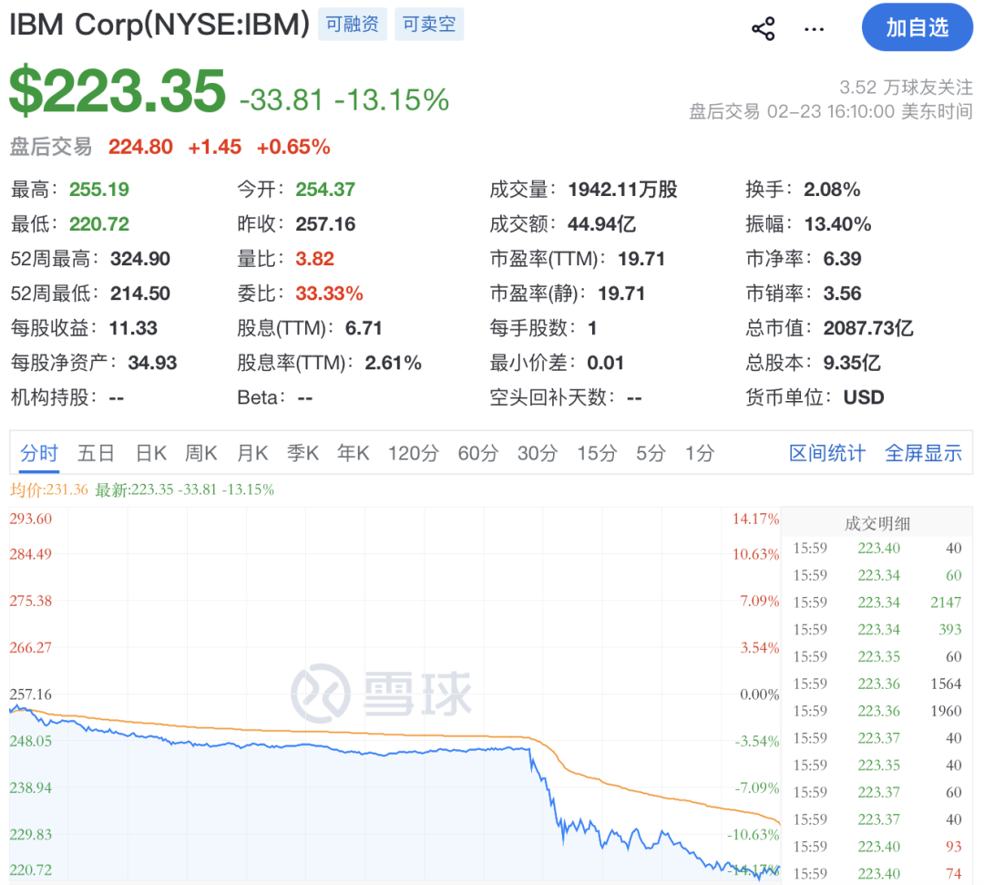 消息面方面,AI初创公司Anthropic宣布其Claude Code产品新增编程功能,可实现商业编程语言COBOL大部分研究分析工作的自动化,引发市场对IBM大型主机业务前景的担忧。IBM股价当日暴跌超13%,创25年来最大单日跌幅,2月以来累计跌幅已达27%,或将创下数十年来最差单月表现。