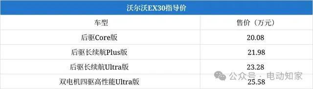国内的沃尔沃EX30(配置|询价)于2024年5月正式上市,新车共推出4款配置车型,售价区间为20.08 - 25.58万元。
