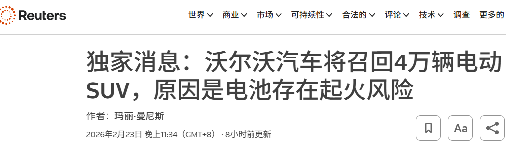 电动知家消息,2月23日晚间,据路透社独家报道,沃尔沃汽车因电池存在起火风险,将在全球范围内召回超过4万辆旗舰电动SUV车型EX30。此次召回涉及车辆总数达40323辆,主要分布于北美、欧洲及亚太市场。