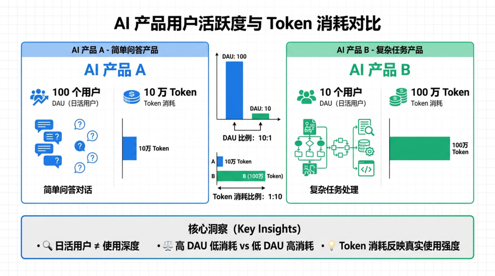 比如,AI产品A有100个日活用户,每人每天仅进行一次简单问答,总Token消耗10万;而AI产品B只有10个日活用户,却用它处理复杂任务和工作流,总Token消耗100万。