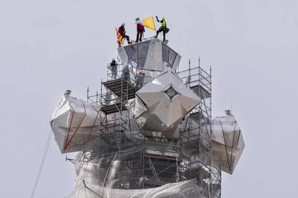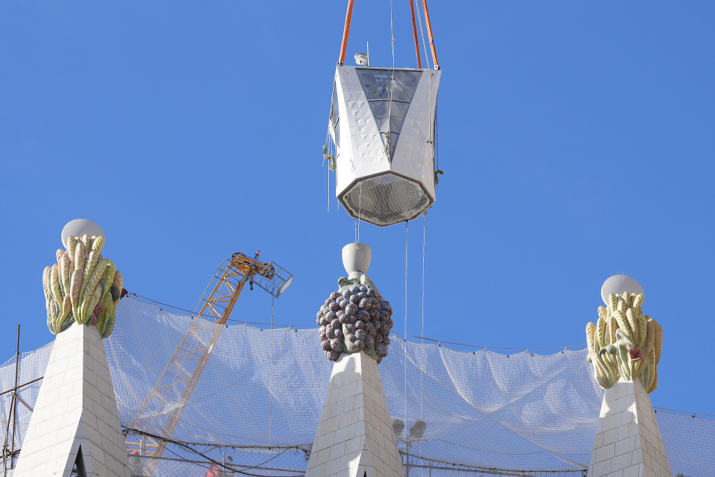数名工人指引一台起重机安装圣家族大教堂耶稣基督塔顶。视觉中国 图