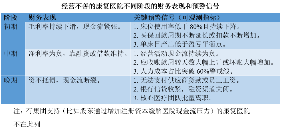 多数民营康复医院既无公立医院的财政支持与患者信任,也无法像高端私立医院依赖高净值自费客户,经营能力直接决定生死。从重要性看,现金流>利润>收入:短期看现金流,中长期看利润与收入。稳定低成本获客、控成本(尤其是人力成本)、提效率是运营关键,懂医疗、医保与本地化运营的团队能避免诸多风险。若病源枯竭、成本失控、效率低下,便会踏入经营困境红线,其如同慢性失血,不同阶段有不同财务表现与预警信号(见下表)。