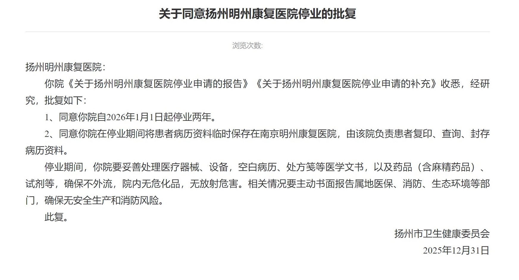 2025年12月31日,扬州市卫健委发布公告,宣布扬州明州康复医院自2026年1月1日起停业两年。