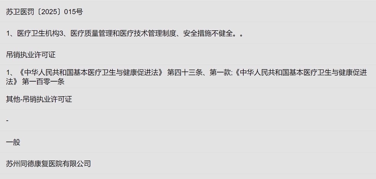 民营医院是医疗与医保监管的双重重点,承受更严格审视。优秀运营可规避经营破产,却难抵御违规关停。违规关停是触碰法律与监管“高压线”的急性强制出局,是最锋利的风险。民营康复医院的违规多与“降本增效”相关:经营困难时,可能通过“违规套取医保”增效,为降人力成本导致医务人员不足或资质欠缺。从处罚案例看,使用非卫生技术人员、超范围执业、骗保(虚构服务、挂床、串换项目、伪造病历等)是常见违规行为。2025年,苏州同德康复医院因管理不善和欺诈骗保,被吊销执业许可证、终止医保协议,责任人被追究刑事责任。