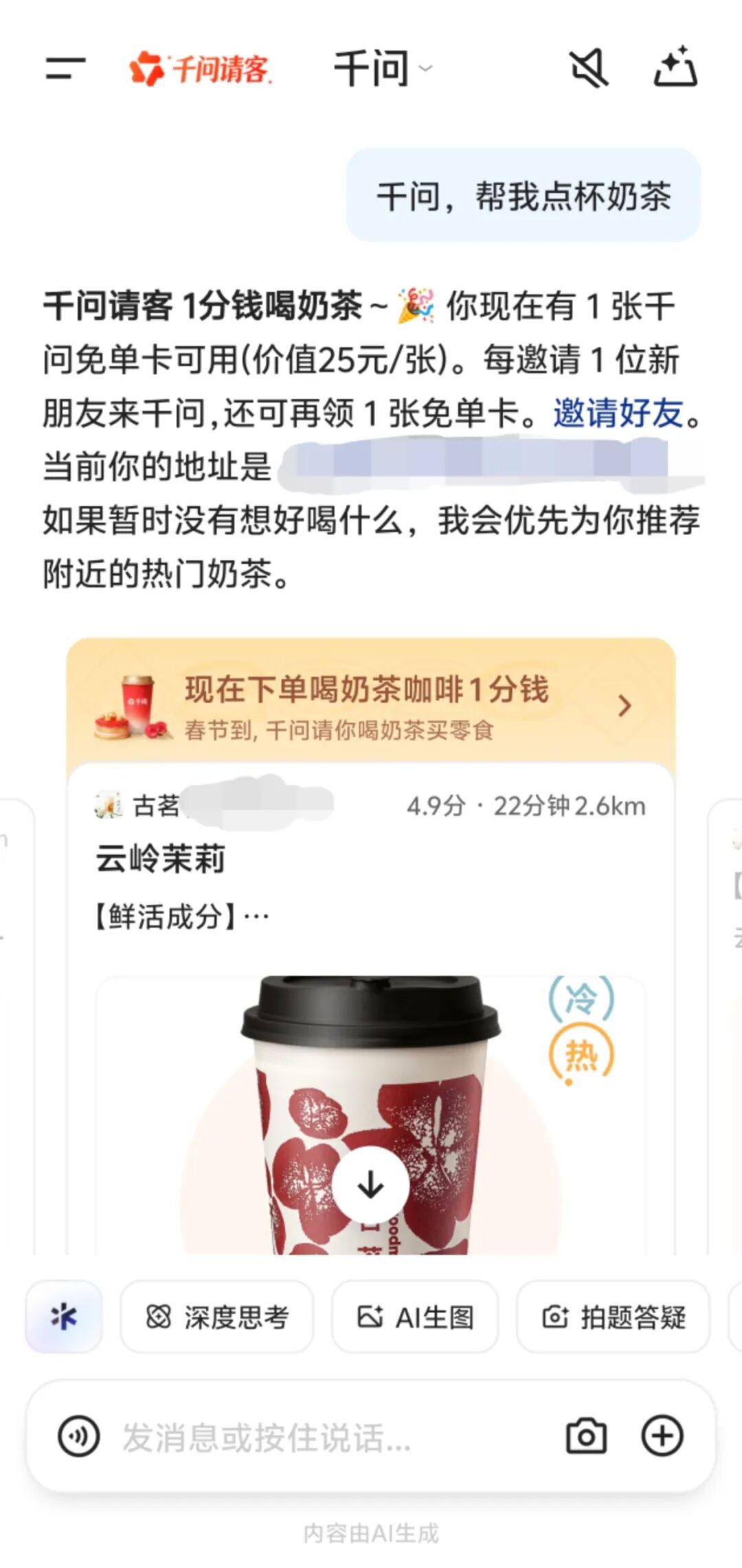 以千问的春节活动为例,阿里利用几乎零门槛的“免费喝奶茶”活动吸引用户首次使用。一杯奶茶价格二三十元,用户的决策成本极低,体验门槛也很低,只需要说一句“千问,帮我点杯奶茶”,就能完成点单。