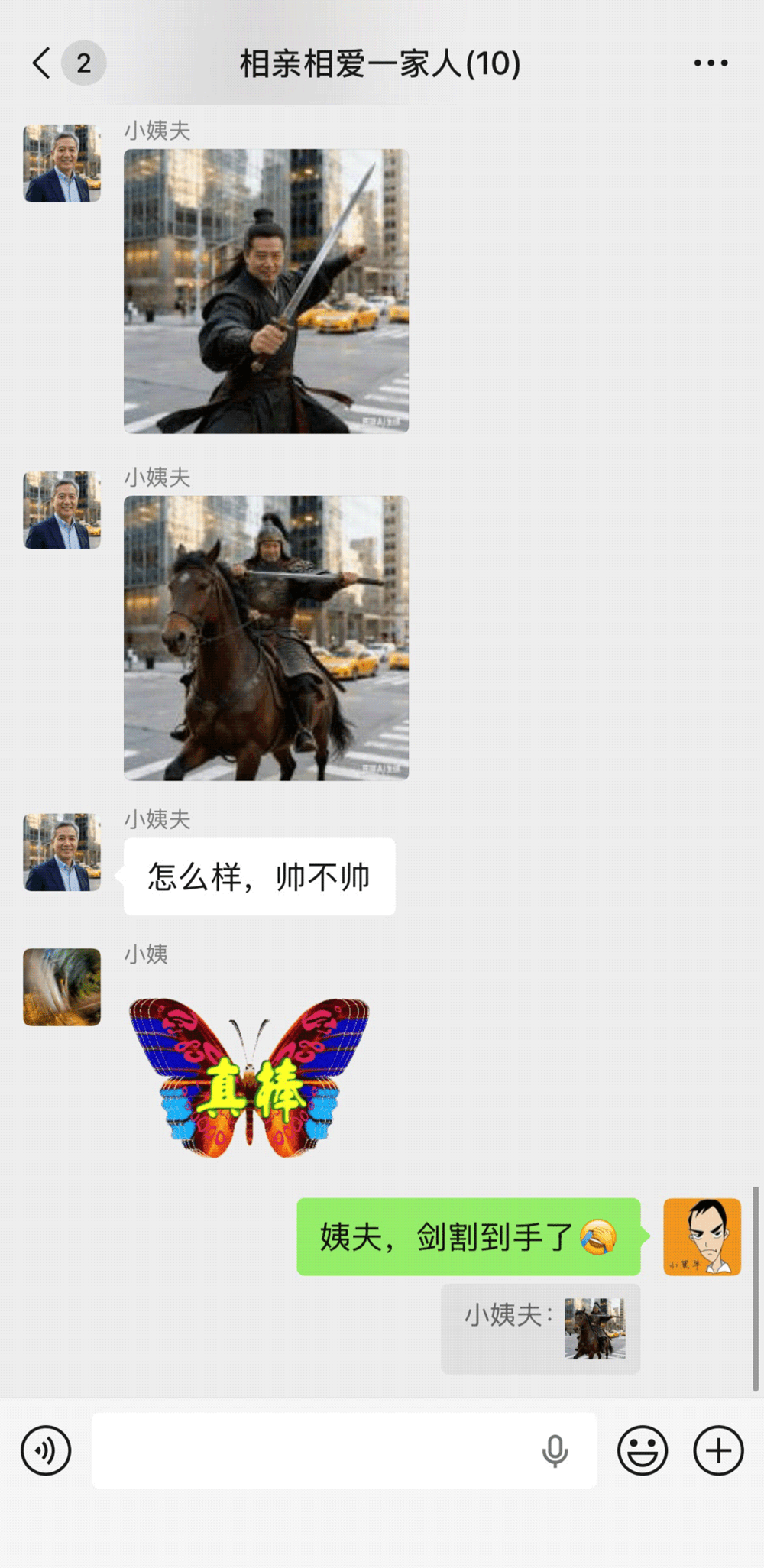 比如小姨两口子用智能手机没问题,抢AI红包溜,偶尔用AI P图,小姨夫还迷上把自己P成将军、大侠分享到家族群。
