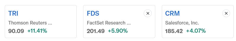 股价反应非常直接。汤森路透(TRI)单日上涨11.4%,创下2008年以来最大单日涨幅;FactSet(FDS)上涨近6%;Salesforce(CRM)反弹超过4%。