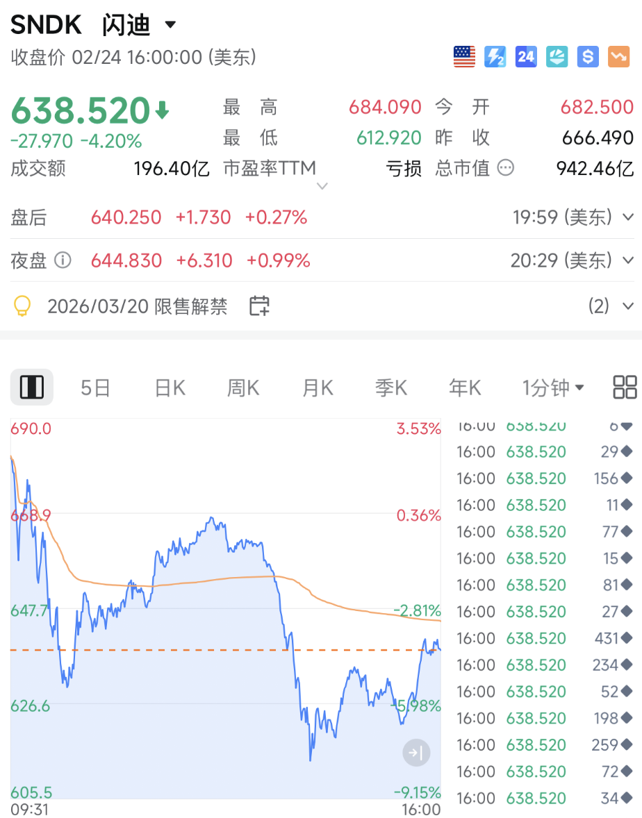 香橼在社交媒体上发布做空报告称,当前市场对闪迪的定价逻辑存在根本性错误,存储芯片供应紧张的局面只是“海市蜃楼”,行业周期顶部已临近。受此影响,闪迪股价于美东时间2月24日盘中大幅下挫,最终收跌4.2%,报638.52美元。