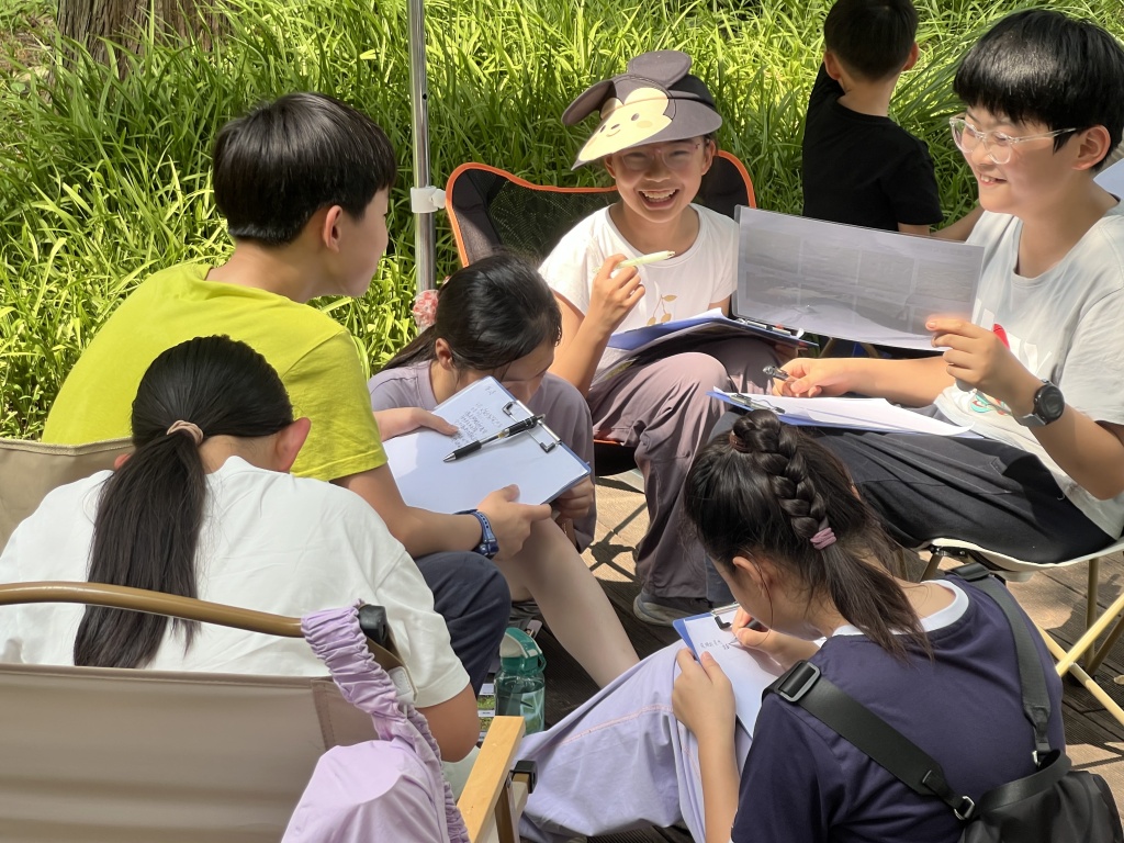 2025年9月,上海后滩湿地亲水教育活动中,学生对照植物创作诗歌与绘画。王昀 图