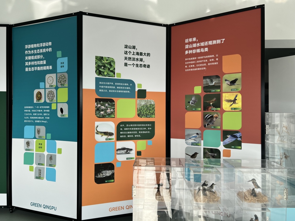 2025年12月22日,青浦区环境监测站生物多样性展厅一角,陈列标本与挂图,参访者可观摩臭气嗅辨、玻片制作等实验。王昀 图