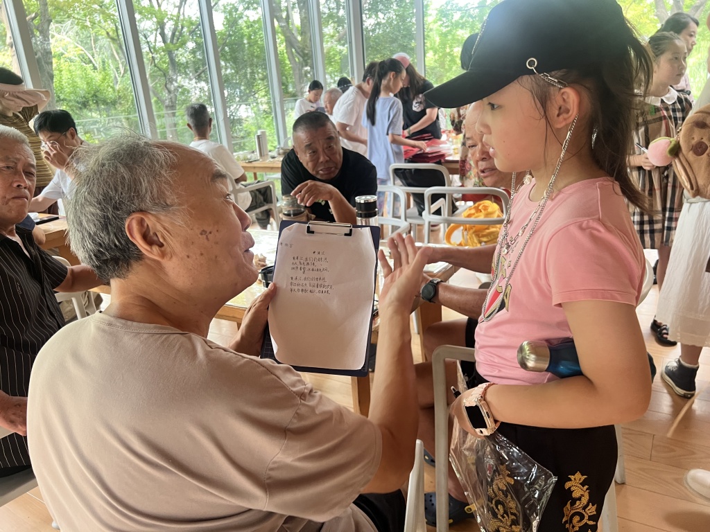 2025年9月,滨江公共驿站里,老人阅读孩子为母亲河写的诗。王昀 图