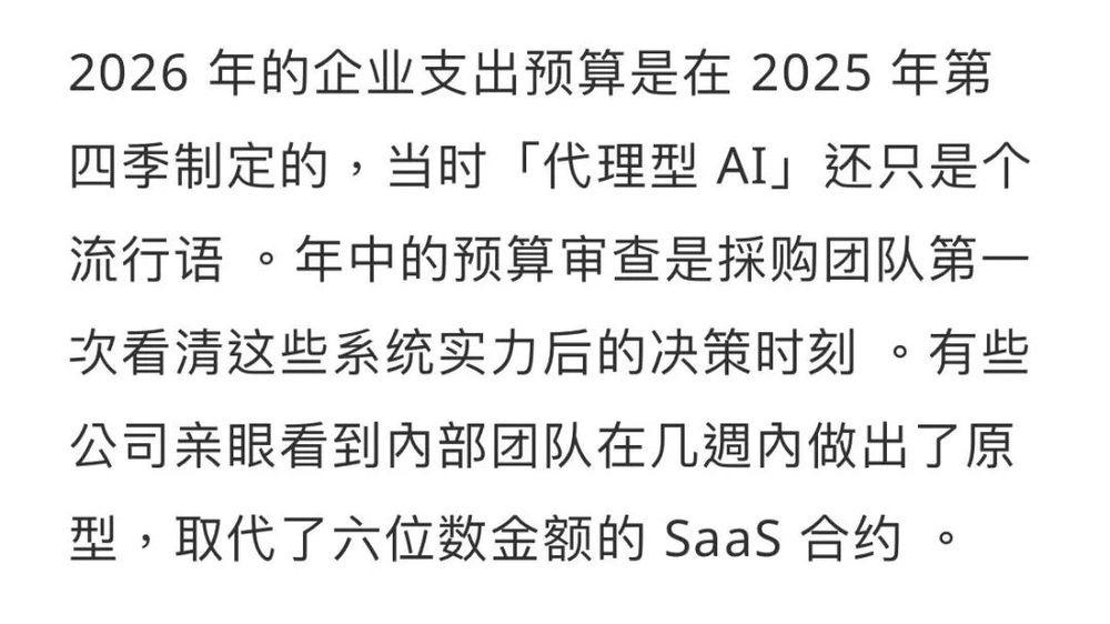 第一个层面是SaaS公司将面临危机(SaaS即软件服务模式,类似金蝶这样的企业),因为未来每个人都能编写自己的专属软件,不再需要过多的外部工具。