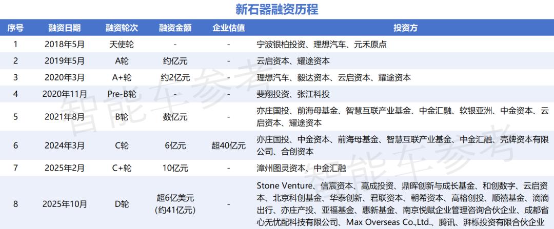 理想汽车、云启资本等是新石器早期投资者;D轮有滴滴、腾讯、阿联酋磊石资本等加入。