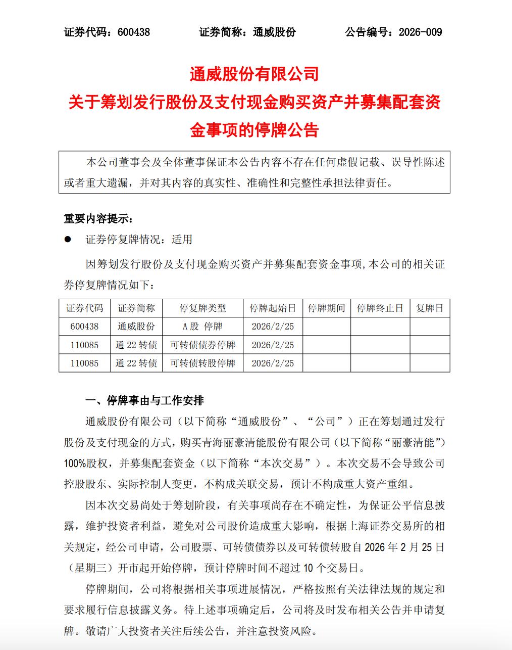 为了确保公平信息披露,维护投资者的利益,避免对公司股价产生重大影响,依据上海证券交易所的相关规定,通威股份的股票、可转债债券以及可转债转股自2026年2月25日开市起开始停牌,预计停牌时间不超过10个交易日。