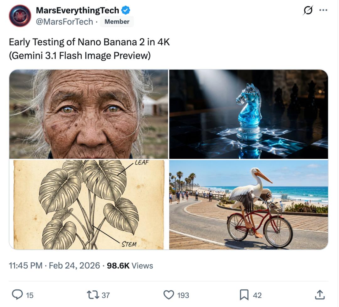 该自媒体引用了另一位X平台网友MarsEverythingTech在2月24日发布的推文,其中Nano Banana 2(Gemini 3.1 Flash Image预览版)的早期测试4K生成图也随之流出。从下面的图片可以看到,四张图片在细节生成和文字渲染等方面表现不错。