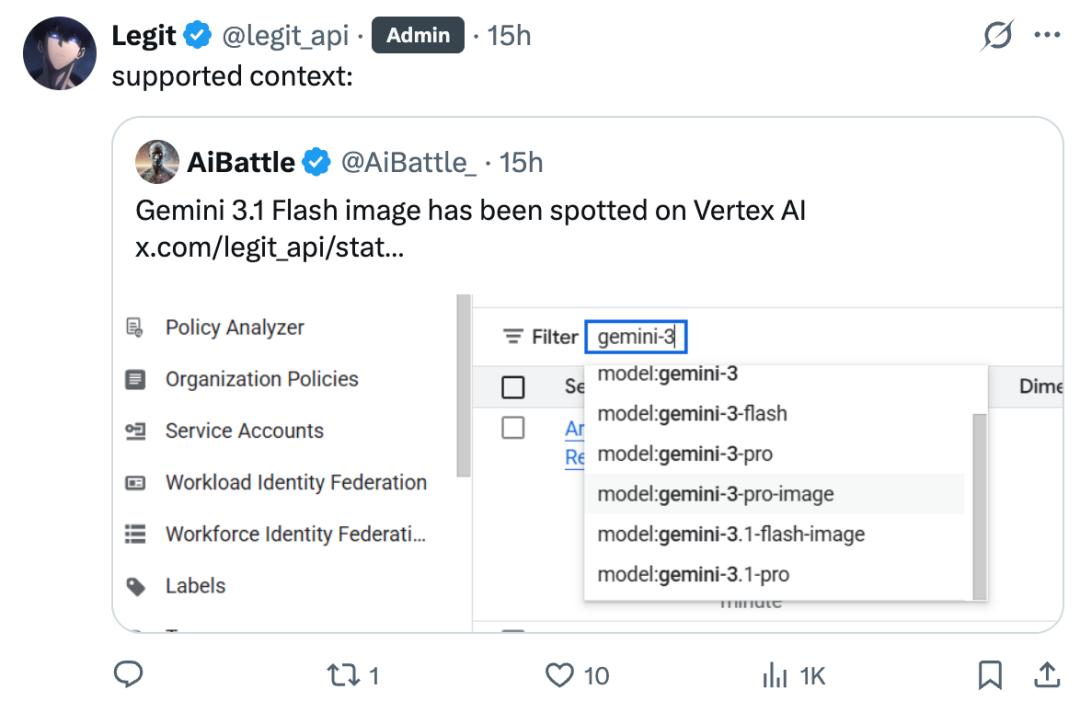 这位开发者还提供了在谷歌云的企业级AI平台Vertex AI网站上发现Gemini 3.1 Flash Image镜像的证据。如下图所示,在输入Gemini-3后,下拉页面出现了Gemini 3.1 Flash Image模型的名称。