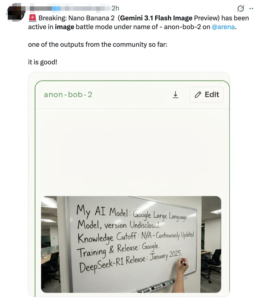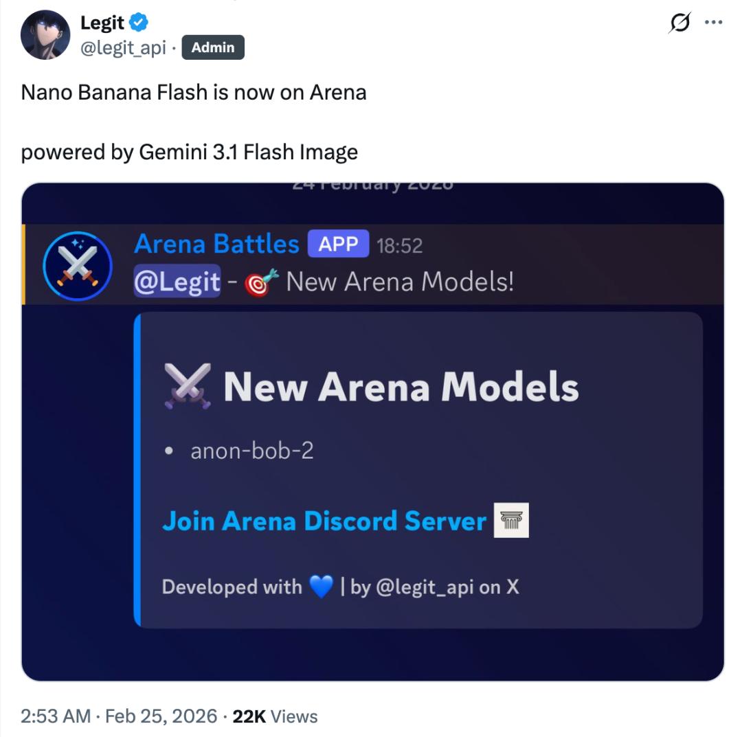 随后,一位名为Legit的知名开发者发布推文称,一个新的匿名模型anon-bob-2已经上线,它很可能是竞技场Arena.ai(原LMArena)上的新款Nano Banana Flash模型,由Gemini 3.1 Flash Image驱动。不过智东西登录Arena.ai后并未发现这一模型,推测可能是测试版已经下线。