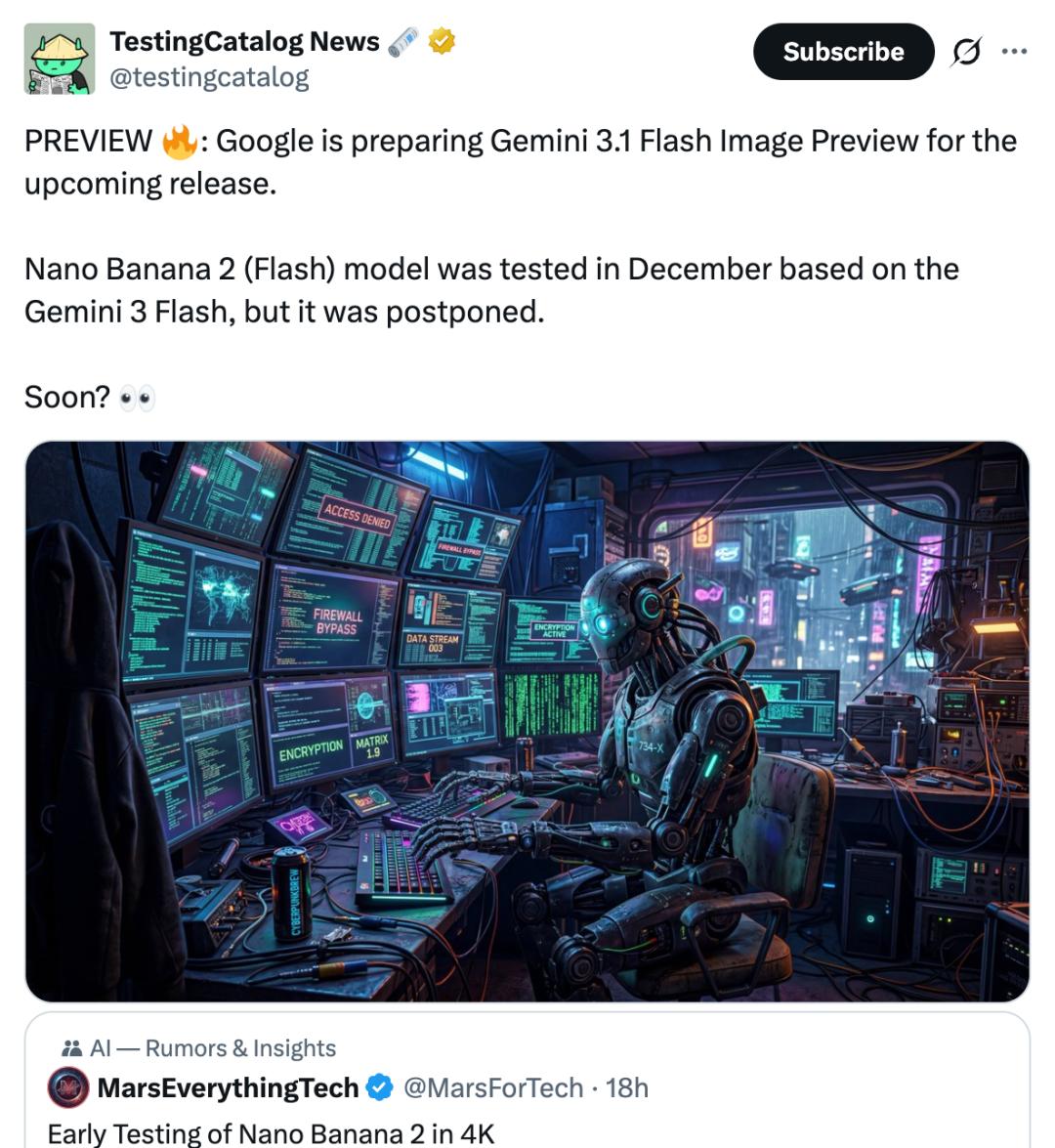 TestingCatalog News是AI领域关注度较高的自媒体,它在今日的推文中提到,谷歌正在为即将发布的Gemini 3.1 Flash镜像预览版做准备。基于Gemini 3 Flash的Nano Banana 2(Flash)模型已于去年12月进行了测试,不过之后推迟了发布,现在可能很快就会推出。该自媒体还发布了一张疑似由Nano Banana 2生成的图片。