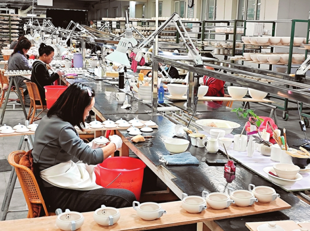 1公里外的生产车间里,传统制瓷工序结合现代科技。董事长李建平(八义窑红绿彩瓷烧制技艺国家级非遗传承人)说,每道工序先由自动化设备操作,再经瓷工修整,形成标准化生产体系。红彩烧制曾是难题,古代工匠凭经验把控温度,技艺一度失传。2012年,李建平团队经上万次试验,量化关键数据,让技艺重焕生机。如今制瓷工序达140多道,产品品质稳定。2021年,该技艺入选国家级非遗。