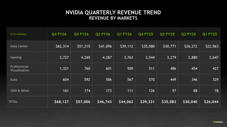 数据中心收入:623亿美元,环比增长22%,同比增长75%,占总营收的91.5%,是核心业务