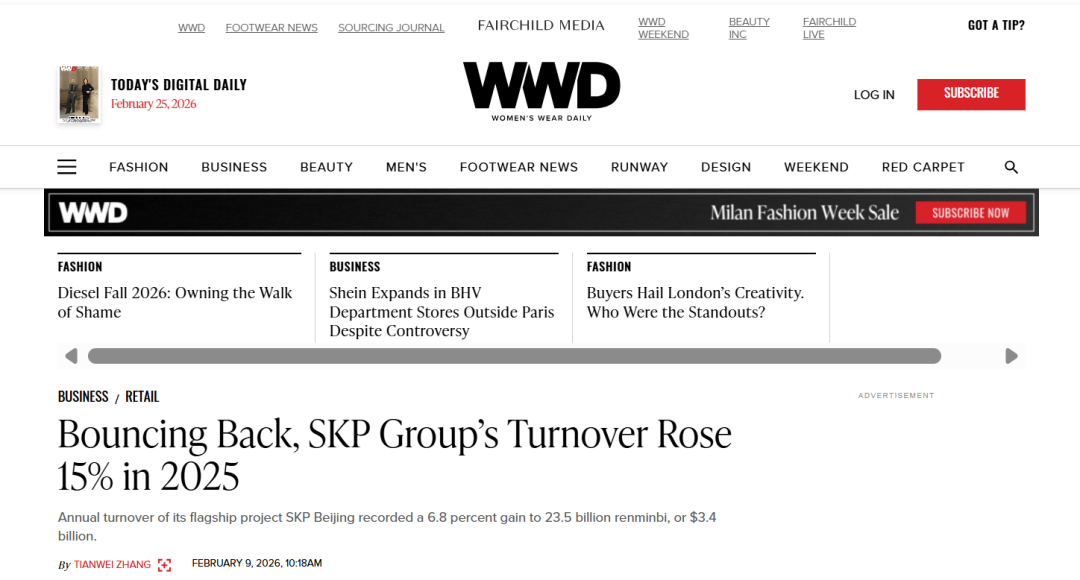 近期,外媒WWD援引匿名知情人士消息称,SKP集团2025年销售额同比增长15%。其中,作为旗舰项目的北京SKP,2025年销售额达235亿元(约34亿美元),同比增长6.8%。