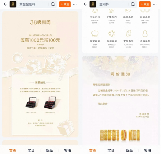 老铺黄金曾在2月18日发布调价公告,宣布预计在2月28日对产品价格进行调整。在此背景下,在2月26日至3月9日天猫“3·8焕新周”期间,老铺黄金官方旗舰店推出了“每满1000元减100元,上不封顶”的优惠活动,并且每天14点、20点会定时上架补货,这一举措引发了调价前消费者的集中采购热潮。此前,老铺黄金还分别在2025年8月和当年10月进行过两次价格上调。
