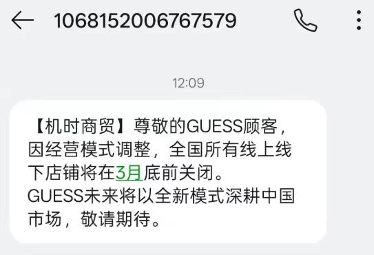 联商快讯:2月27日,众多消费者收到美国知名时尚品牌GUESS的官方通知短信,内容显示因经营模式调整,GUESS在全国的所有线上、线下店铺将在3月底前正式关闭。品牌方同时表示,未来会以全新模式深耕中国市场,但具体的新布局尚未对外公布。