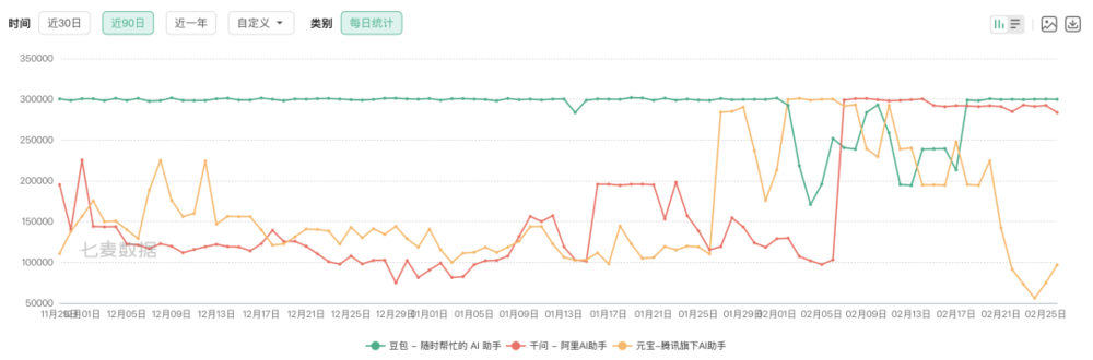 若对数据进行深入分析,便能发现此次春节红包大战存在差异。通过对比元宝、千问、豆包过去三个月在七麦数据上的预估下载量,可得出如下图表:
