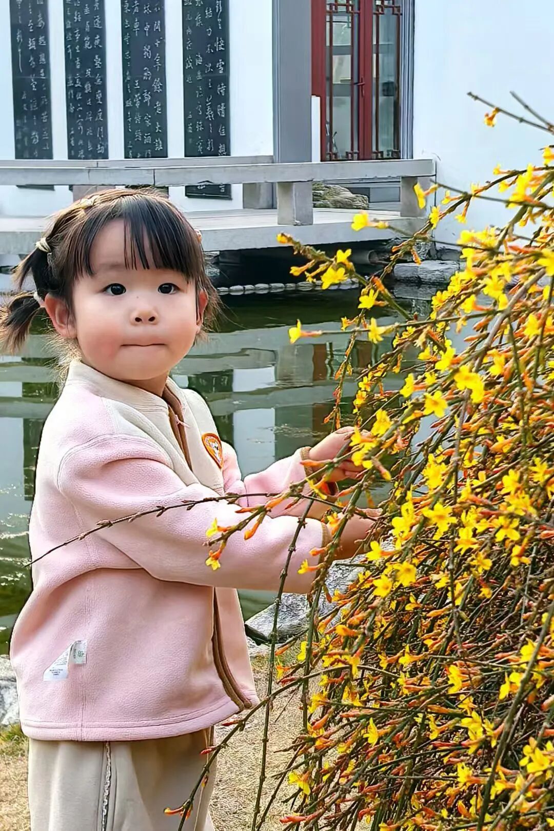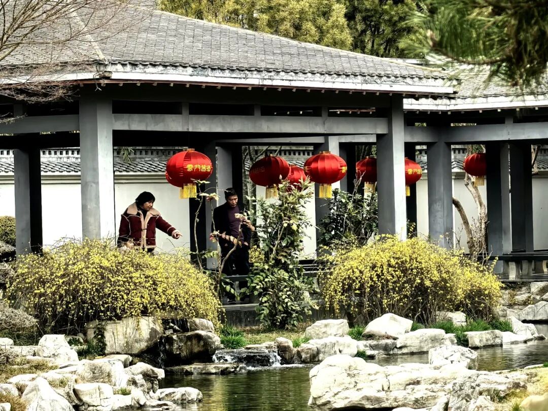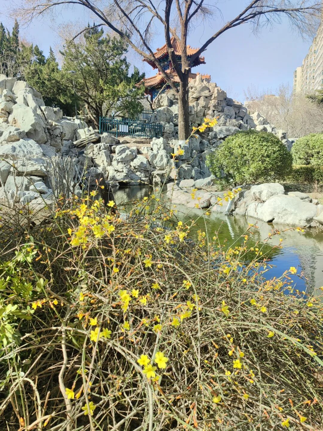 迎春花与流水、假山相伴